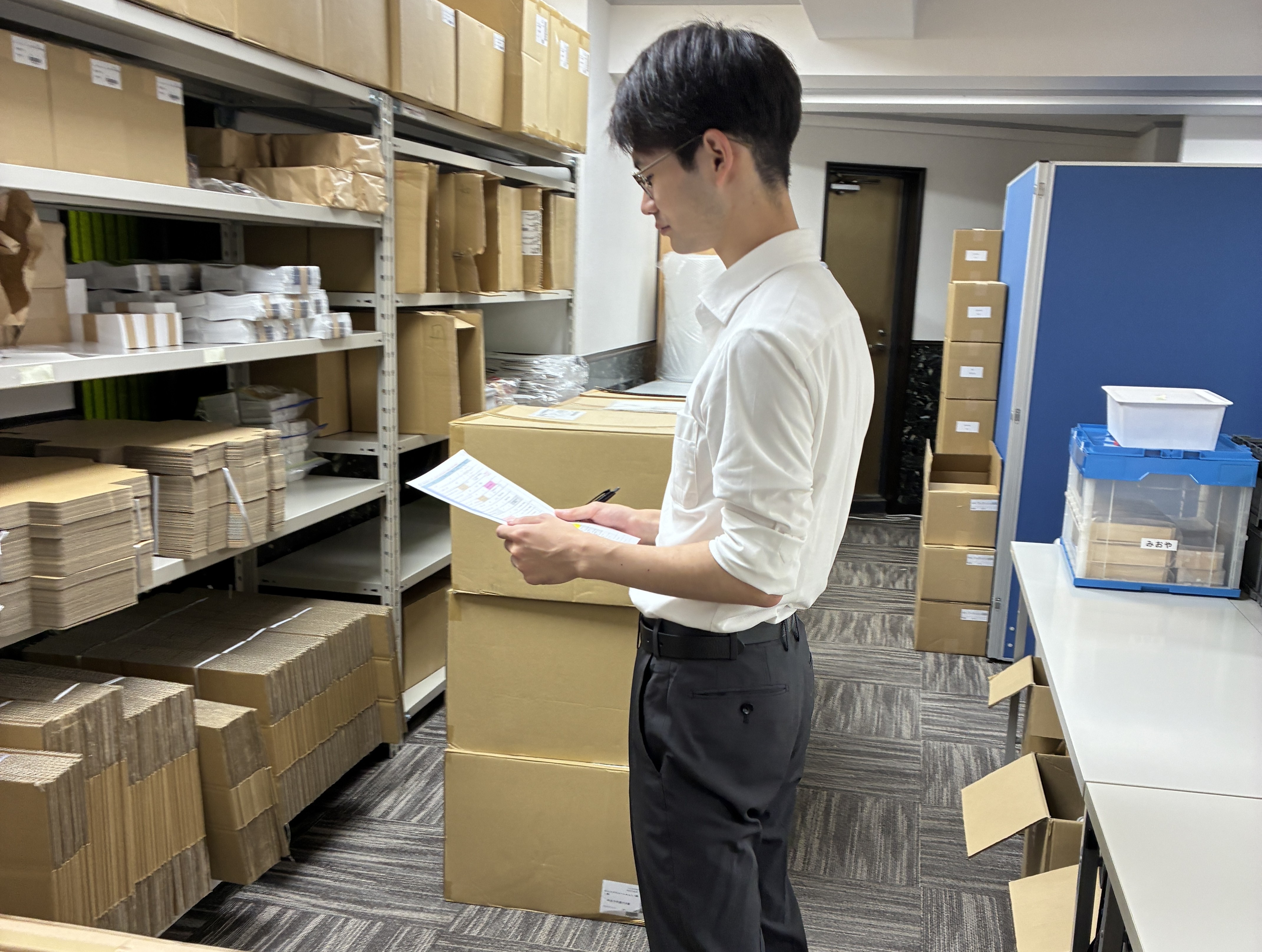 資材の発注管理について理解を深めるため、倉庫の棚卸に同行いたしました。